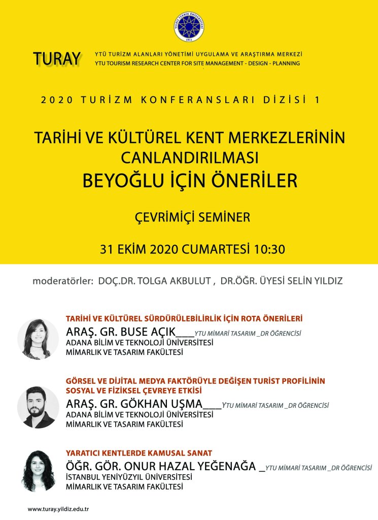 YTÜ Turizm Alanları Yönetimi Uygulama ve Araştırma Merkezi tarafından düzenlenen “Tarihi ve Kültürel Kent Merkezlerinin Canlandırılması – Beyoğlu için Öneriler” isimli konferans 31 Ekim 2020 Cumartesi günü saat 10:30 da Zoom üzerinden çevrimiçi olarak gerçekleştirilmiştir.