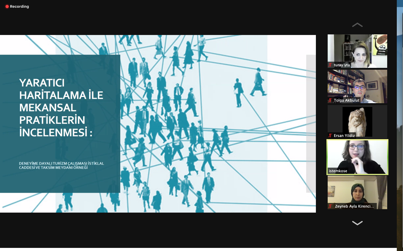 Konferans kapsamında Dr. Öğretim Üyesi Selin Yıldız tarafından yürütülen “Turizm Amaçlı Yerleşme ve Yapılanmada Makro ve Mikro Ölçekte Programlama ve Tasarım İlkeleri” dersi kapsamında yapılan çalışmalar bağlamında, Öğr. Gör. İstem Seçkin Parlakyıldız Köse tarafından “Yaratıcı Haritalama ile Mekansal Pratiklerin Mekanın Halleri ve Hisleri Üzerinden İncelenmesi Önerisi: Deneyime Dayalı Turizm Çalışması örneği Olarak İstiklal Caddesi ve Taksim Meydanı örneği”, Y. Mimar Can Turan tarafından “Kültürel Turizm Bağlamında İstiklal Caddesi Tiyatroları” ve Araş. Gör. Zeyneb Ayla Kirenci Eruzun tarafından “Kültürel Miras Bağlamında istiklal Caddesi Pasajlarının Yeniden Kullanım ile Canlandırılması” isimli sunumlar gerçekleştirilmiştir. Kendilerine teşekkür ediyoruz.