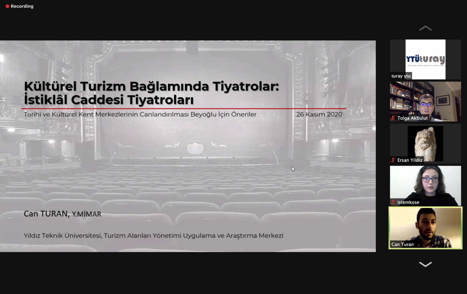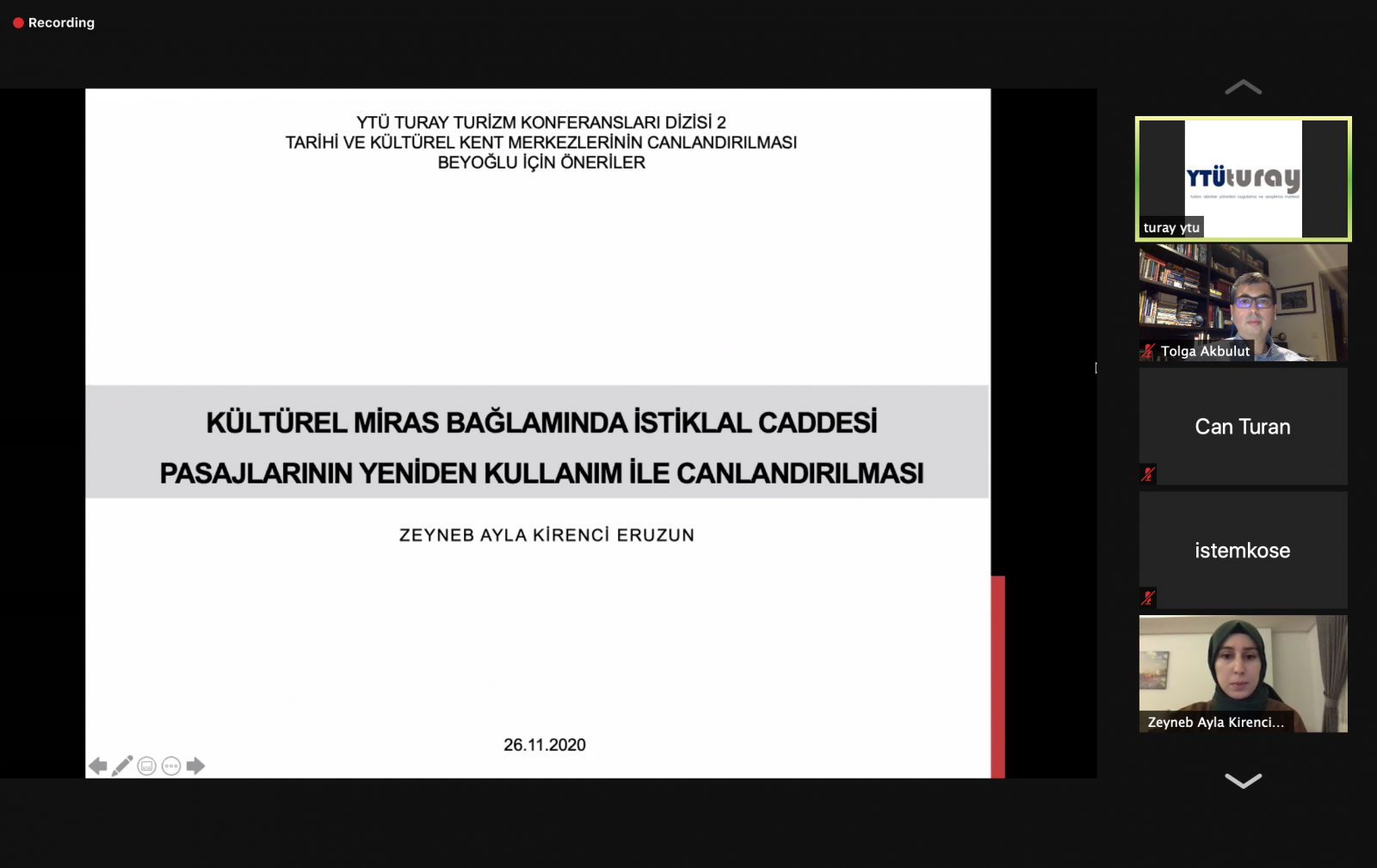 Tarihi ve Kültürel Kent Merkezlerinin Canlandırılması Beyoğlu İçin Öneriler başlıklı konferans 26 Kasım 2020 tarihinde Saat 18:30’da Zoom üzerinden çevrimiçi olarak gerçekleştirilmiştir.
